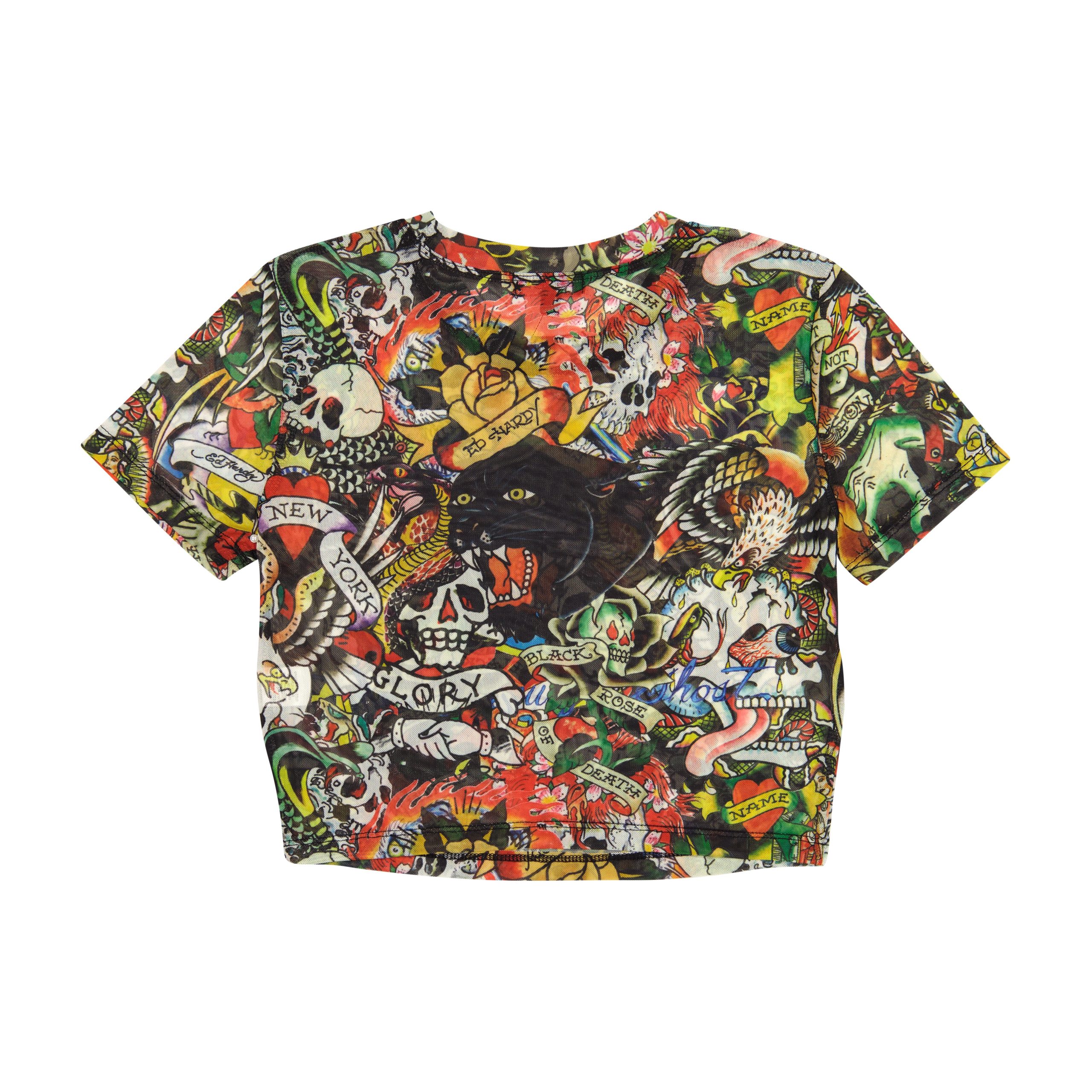Signature baby tee silhouette cut from a power mesh. Features a cropped fit and allover Ed Hardy tattoo print.