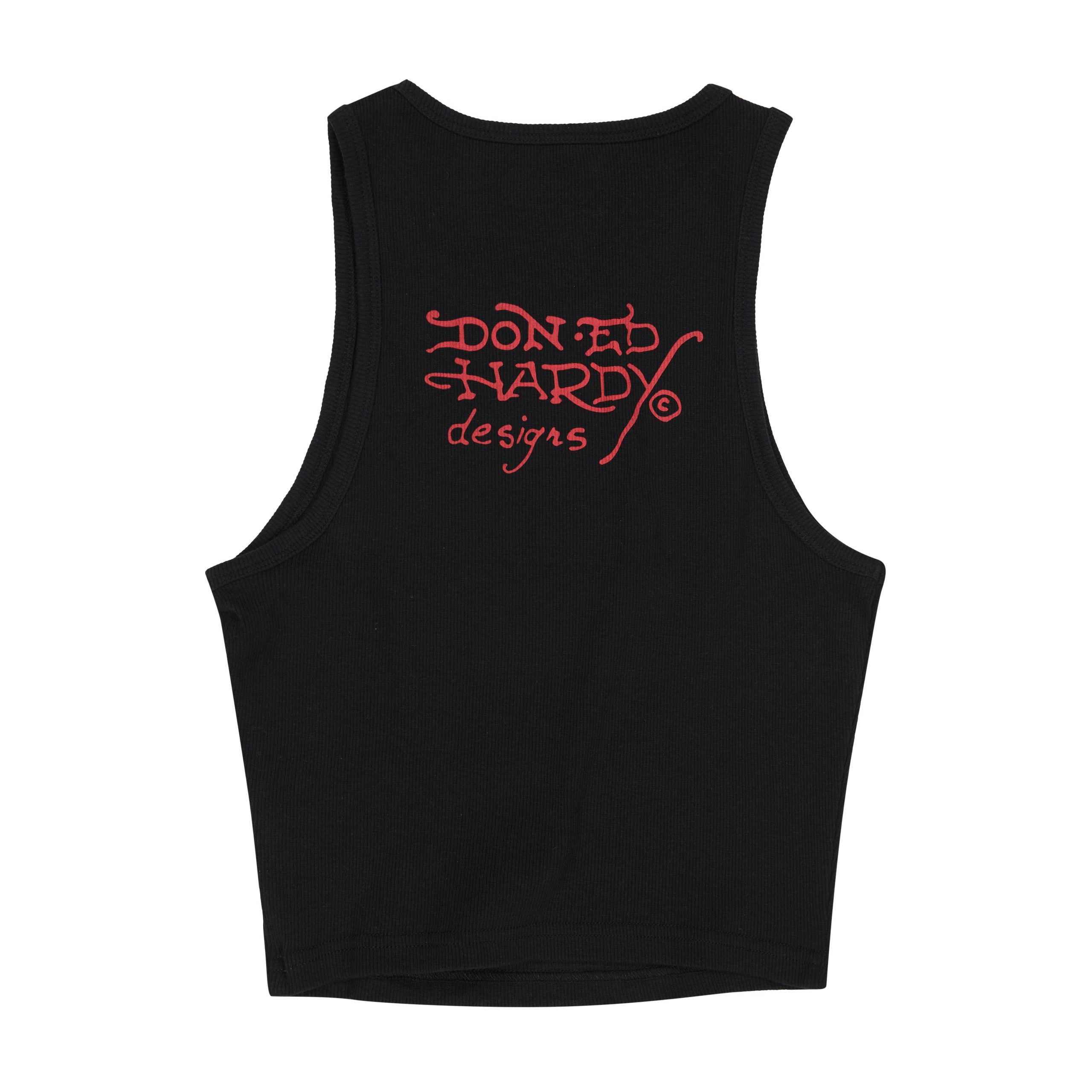 Slim fit cropped tank top with a vintage feel. Features signature Ed Hardy Love Kills Slowly rhinestone graphic and multiple archival logos.
