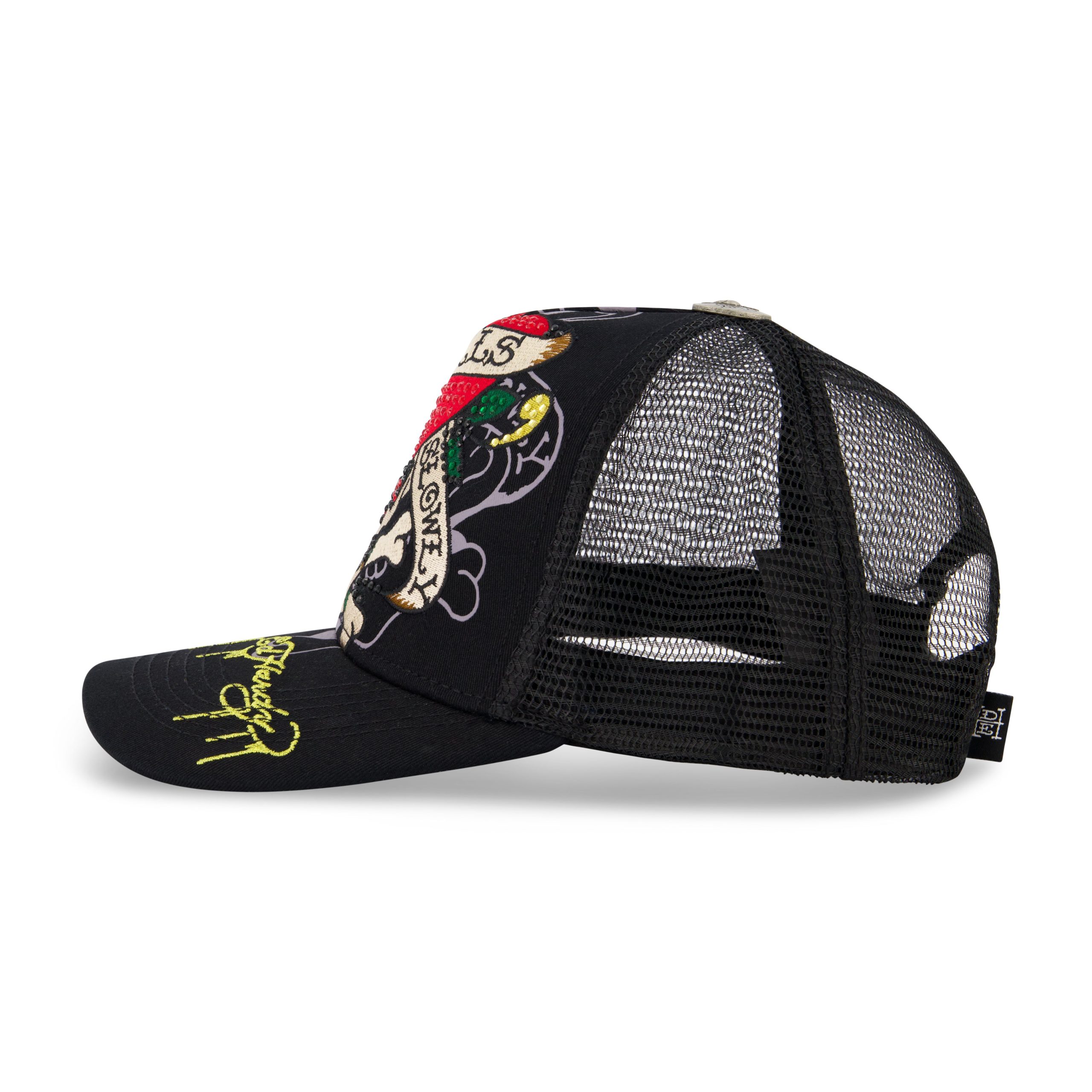 This throwback Ed Hardy trucker features a signature embroidered LKS skull graphic and rhinestone embellishments. Complete with a mesh snap back and curved brim.