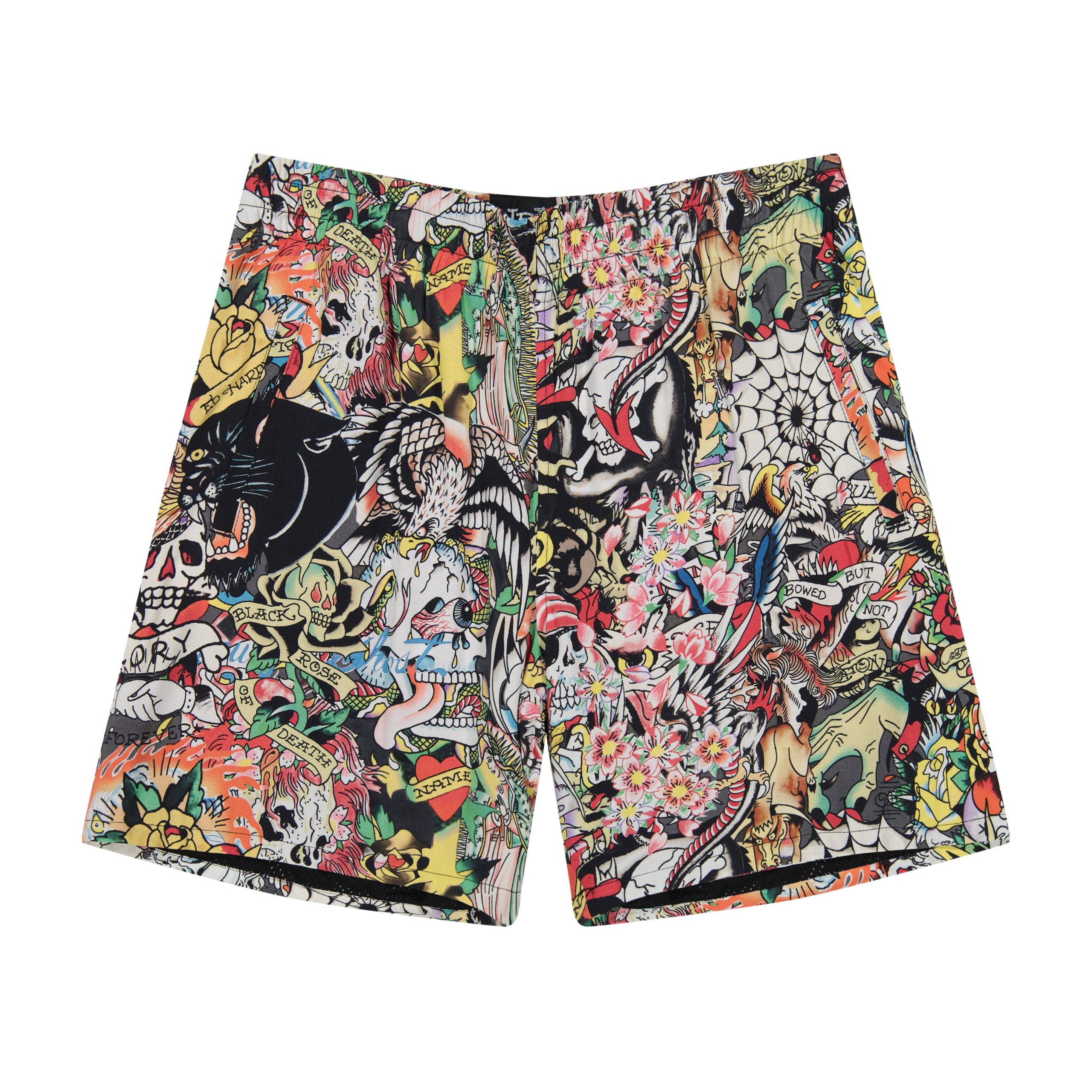 100% rayon woven short featuring two pockets. Complete with signature tattoo collage graphics. Pair with Tattoo Collage Camp Shirt to complete your look.